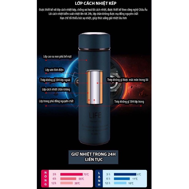 - Bên trong Bình giữ nhiệt LIFE được làm hoàn toàn từ chất liệu inox. được thiết kế với kiểu dáng đẹp, gọn gàng đồng thời giữ nóng và giữ lạnh giúp bạn và người thân thuận tiện trong mọi trường hợp.