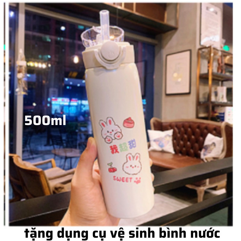 Bình giữ nhiệt INOX 304 họa tiết dễ thương dung tích 500ml , bình nước có ống hút có dâyCAM KẾT