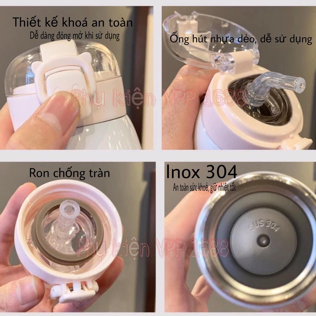 Bình giữ nhiệt cute HOẠT HÌNH , bình nước có ống hút chất liệu inox 304 có dây đeoCAM KẾT