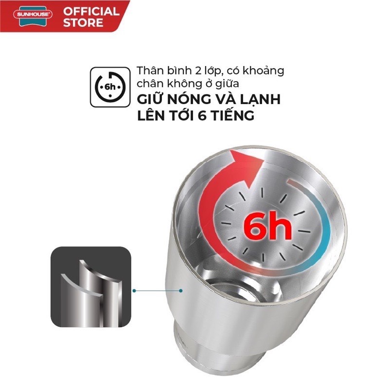 Bình giữ nhiệt SUNHOUSE dùng được với cả đồ uống nóng và lạnh. Với cấu tạo đặc biệt bằng 2 lớp inox cao cấp 304 nên bình có khả năng cách nhiệt tốt, giữ nhiệt lâu, lên tới 6 giờ (cụ thể, nóng: nhiệt độ >55°C, lạnh: nhiệt độ <11°C)