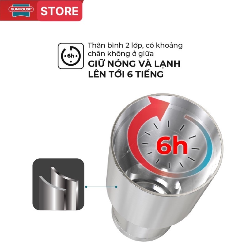 Bình giữ nhiệt SUNHOUSE dùng được với cả đồ uống nóng và lạnh. Với cấu tạo đặc biệt bằng 2 lớp inox cao cấp 304 nên bình có khả năng cách nhiệt tốt, giữ nhiệt lâu, lên tới 6 giờ (cụ thể, nóng: nhiệt độ >55°C, lạnh: nhiệt độ <11°C)