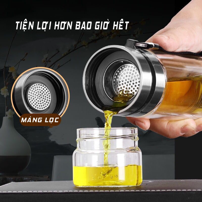 Bình giữ nhiệt kèm bộ lọc pha trà được thiết kế cực kỳ thông minh, dễ sử dụng, là sự kết hợp tuyệt vời giữ bình giữ nhiệt và bộ lọc pha trà. Thân bình làm làm bằng thủy tinh 2 lớp giữ nhiệt cực tốt, bộ lọc pha trà làm bằng inox cao cấp rất bền và an toàn cho sức khỏe. Bình được thiết kế 2 đầu có nắp đậy, 01 đầu để uống nước 01 đầu để lắp bộ lọc pha trà hay thảo dược rất tiện dụng.