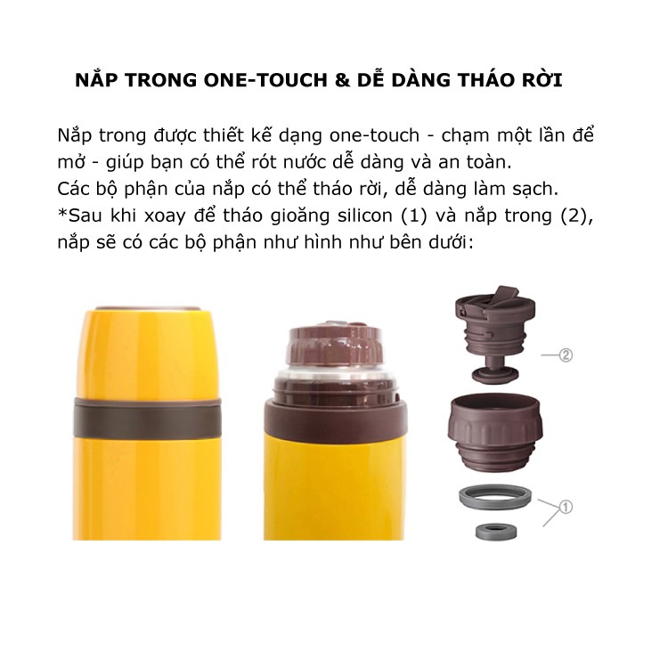 - Nắp bình trang bị vòng silicone, dễ dàng đóng mở linh hoạt, giữ kín hơi, đảm bảo hương vị thức uống.