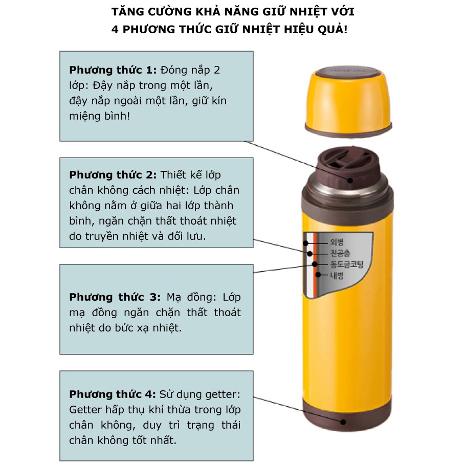 - Lớp chân không được trang bị giữa khoảng cách trong bình và ngoài bình giúp cách nhiệt tốt hơn.