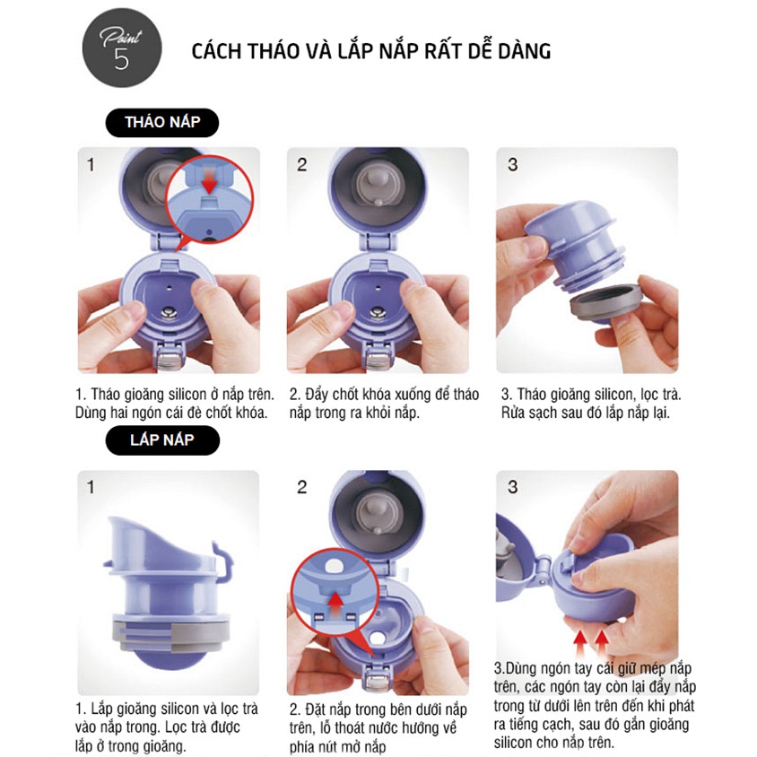 - Nắp có thể tháo rời: Bạn có thể tháo rời từng bộ phận của nắp khi chùi rửa, giúp dễ rửa sạch và sử dụng bình hợp vệ sinh hơn.