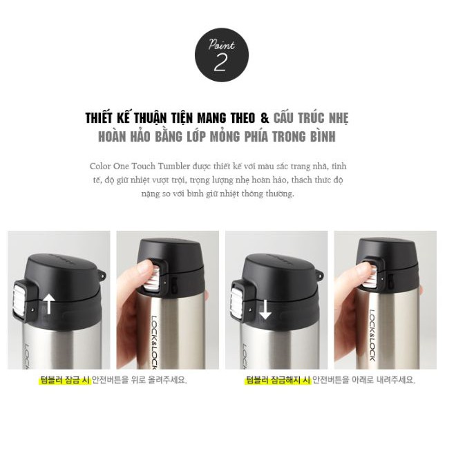 Cấu trúc nắp bình giữ nhiệt Lock&Lock Colorful Tumbler Funcolor LHC3222 (390ml) có nút bật One touch nên mở nắp dễ dàng chỉ bằng 1 tay, nút cài đóng bình an toàn, không làm rỉ nước, an tâm sử dụng ngay cả trẻ nhỏ.