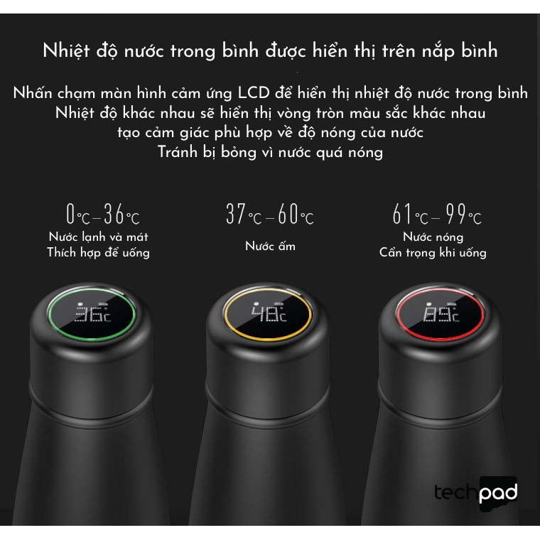 ● Nắp cảm ứng hiển thị nhiệt độ: Thật là tuyệt vời khi chúng ta biết được nước trong bình đang ở nhiệt độ bao nhiêu với 1 cú chạm tay, đèn led hoạt động bằng pin và không cần sạc, không cần thay.
