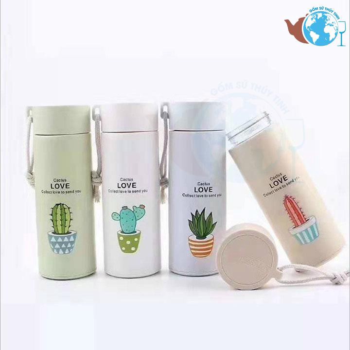 Bình giữ nhiệt lõi thủy tinh vỏ bọc nhựa hình xương rồng 450ml kèm dây xách tiện lợi