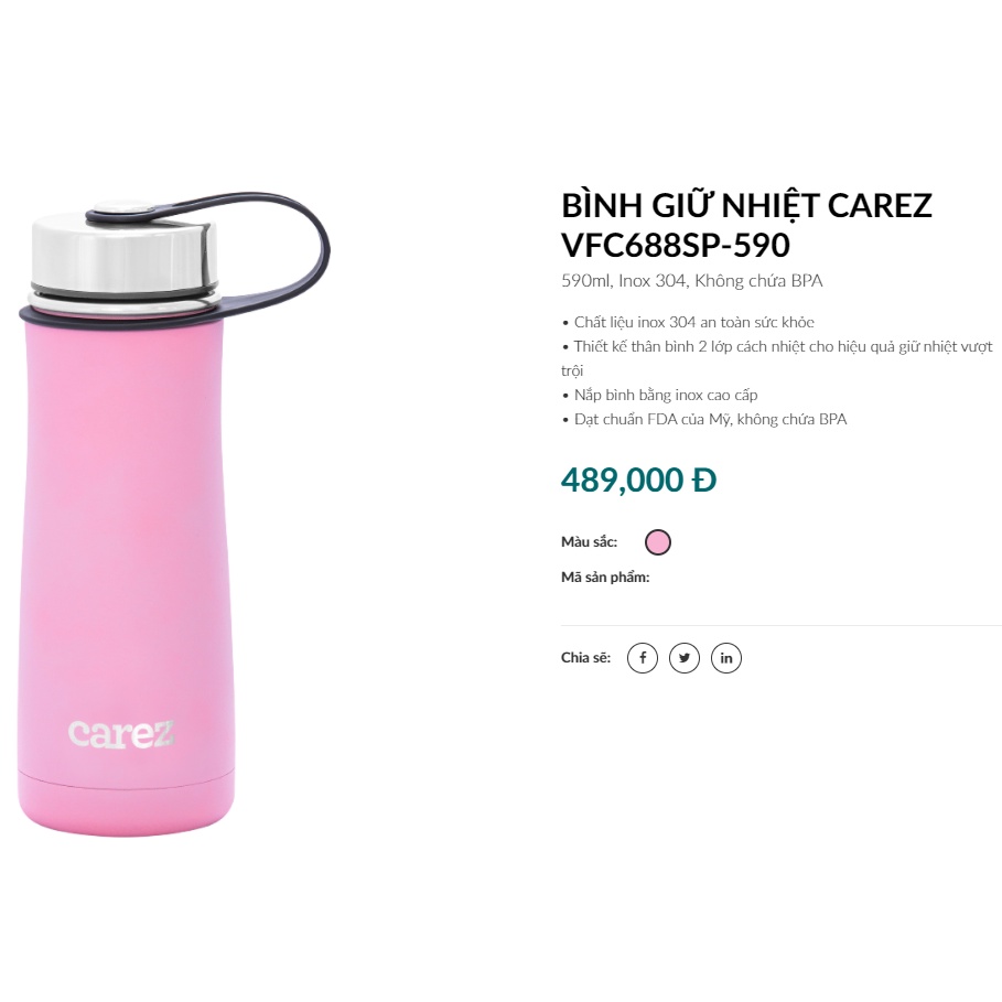- Bình giữ nhiệt Carez model VFC688SP-590 với màu hồng san hô trẻ trung, tươi tắn, thiết kế nắp dạng xoay có quai xách thanh lịch, tiện lợi để treo móc và mang đi, phù hợp để đồng hành cùng bạn khi vận động và thể dục thể thao mỗi ngày.
