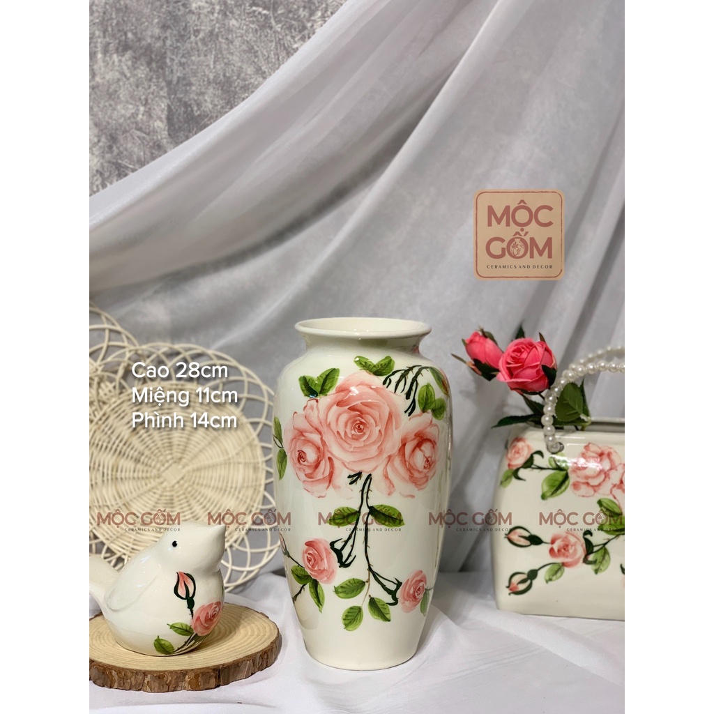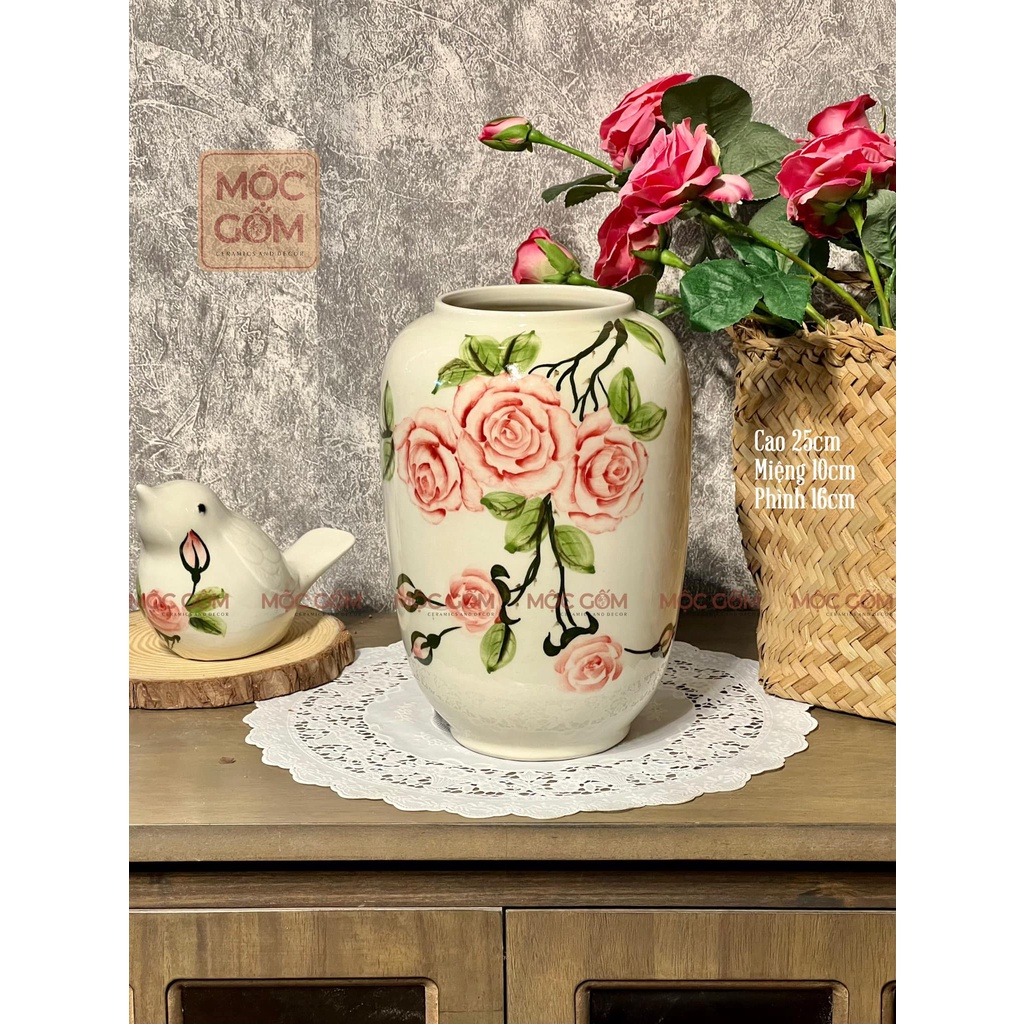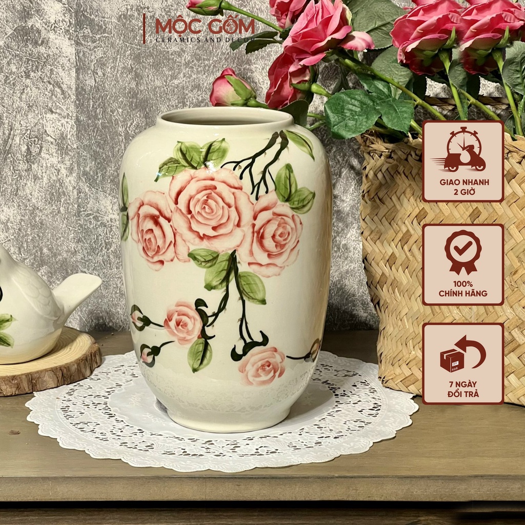 Bình gốm Bát Tràng cao cấp cắm hoa vẽ tay thủ công họa tiết hoa hồng đẹp tinh tế trên nền men khử trang trí Mộc Gốm MG72