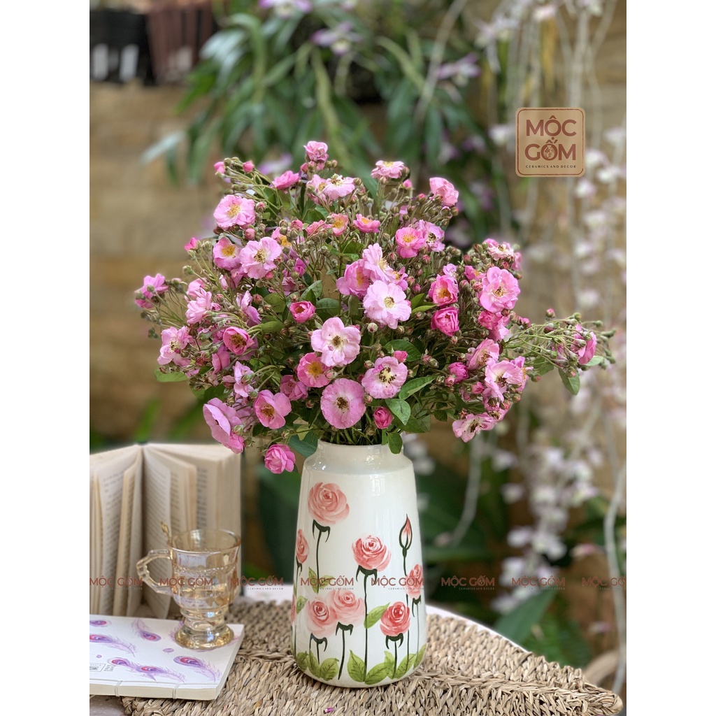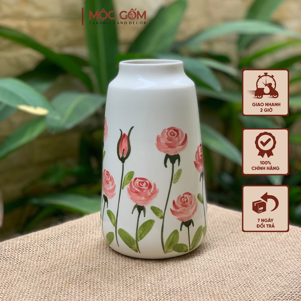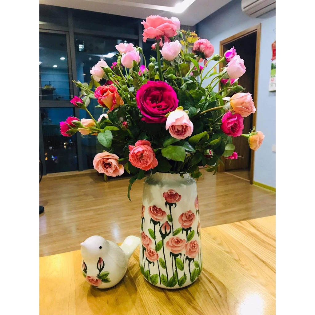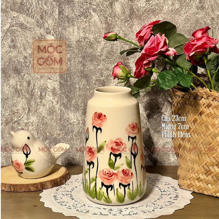 Bình gốm Bát Tràng họa tiết hoa hồng vẽ tay thủ công cắm hoa siêu xinh trang trí nội thất Mộc Gốm Hà Nội MG62
