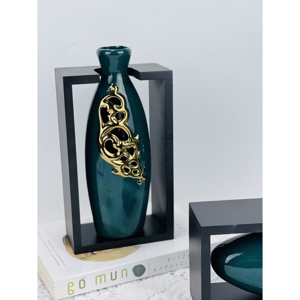 Bộ bình gốm Lọ cắm hoa Bình bông màu xanh Bắc Âu decor cao cấp vẽ vàng sang trọng