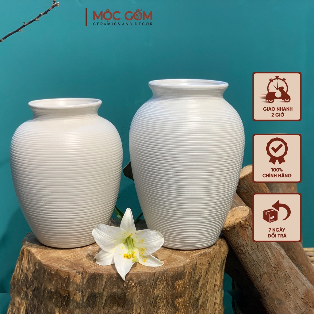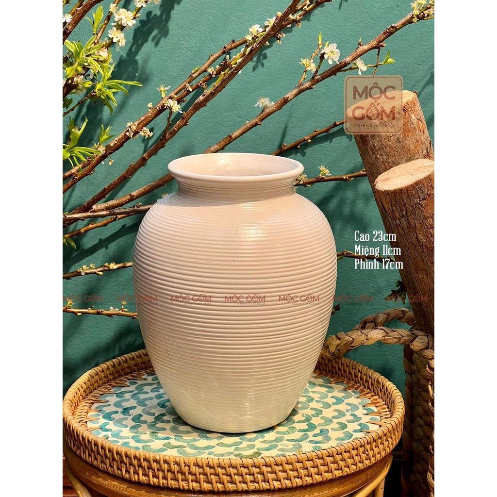 Bình gốm vò tròn cổ cao men trắng lỳ thân ganh Bát Tràng cao cấp cắm hoa dơn đẹp trang trí Mộc Gốm MG61