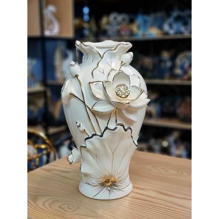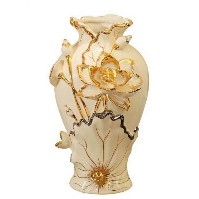Lọ Hoa Gốm- Bình Cắm Bông Cao Cấp Họa Tiết Sen Trắng Mạ Vàng và nghệ thuật đắp nổi đường nét được vẽ vàng hết sức tinh tế và cao cấp. Bình gốm mang phong cách tân cổ điển với vẻ đẹp phú quý và sang trọng.