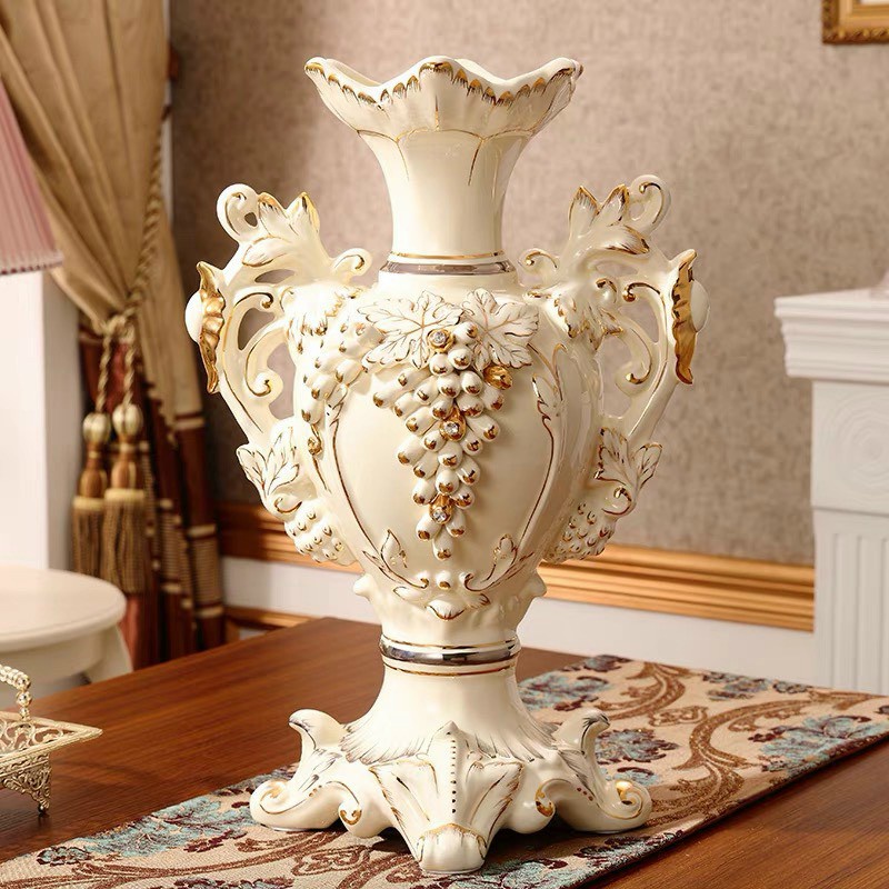 Lọ Hoa Gốm- Bình Cắm Bông Cao Cấp Họa Tiết Chùm Nho vẽ Vàng và nghệ thuật đắp nổi đường nét được vẽ vàng hết sức tinh tế và cao cấp. Bình gốm mang phong cách tân cổ điển với vẻ đẹp phú quý và sang trọng.