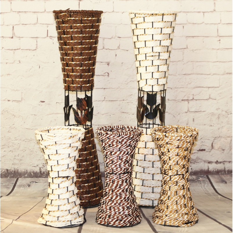 Chất liệu: dây đan giả mây, khung sắt cứng (bình này không đổ nước vào được)