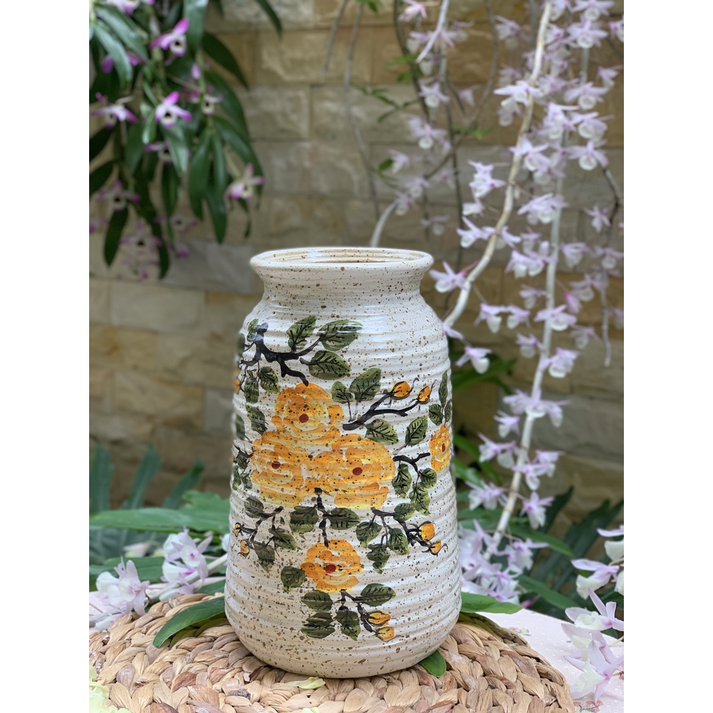 Bình hoa gốm Bát Tràng cao cấp cắm hoa vẽ tay thủ công trên nền men mộc vintage trang trí phòng khách đẹp Mộc Gốm MG78