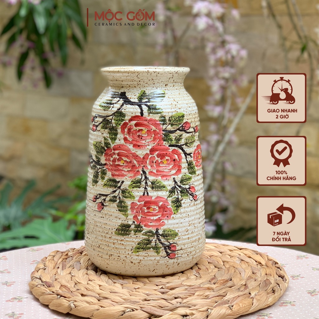 Bình cắm hoa gốm Bát Tràng cao cấp cắm hoa hồng vẽ tay thủ công trên nền men mộc vintage trang trí phòng khách đẹp Mộc GốmMột chiếc bình gốm vẽ hoa hồng thủ công quá đỗi nghệ thuật và điệu đà ! Bình thuộc dòng size vừa,rất để cắm hoa cành cao từ 50cm trở lên.Bình cắm hoa hồng thì đặc biệt đẹp ạ!
