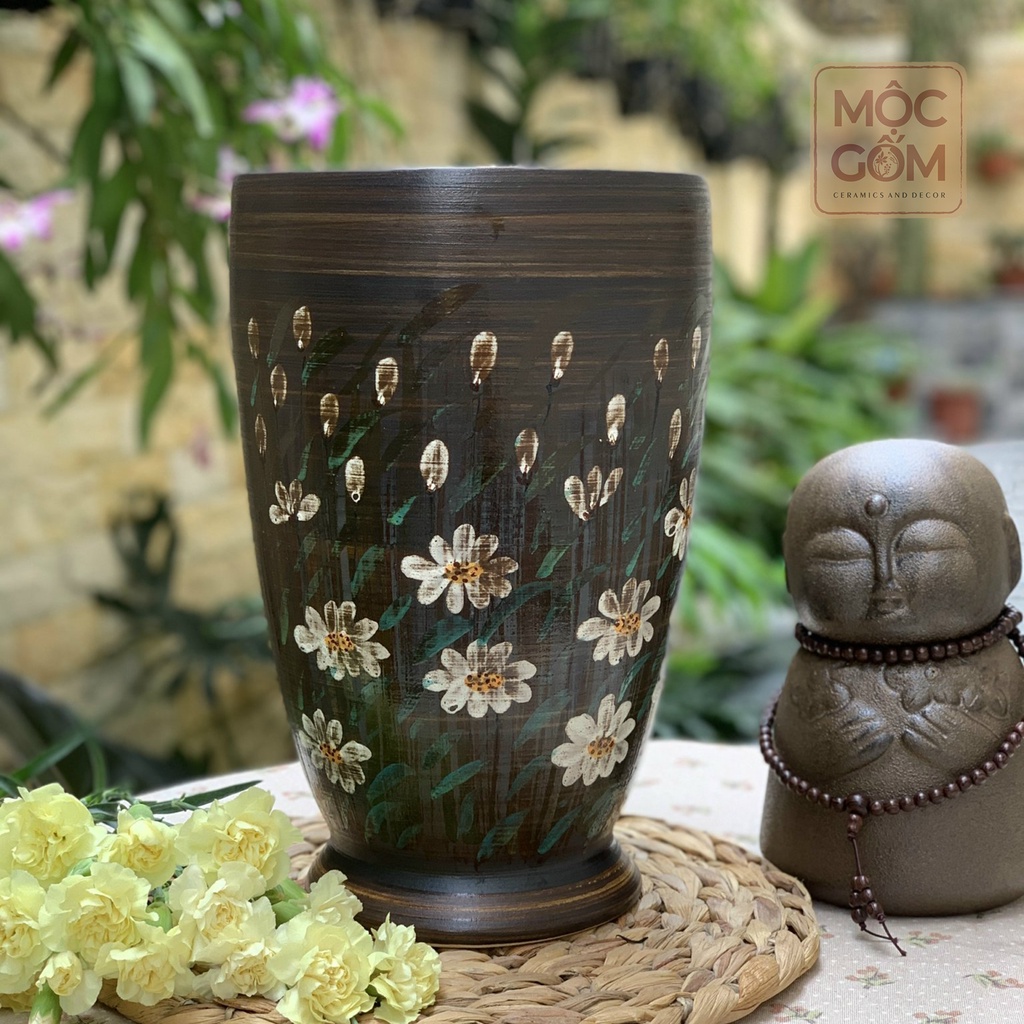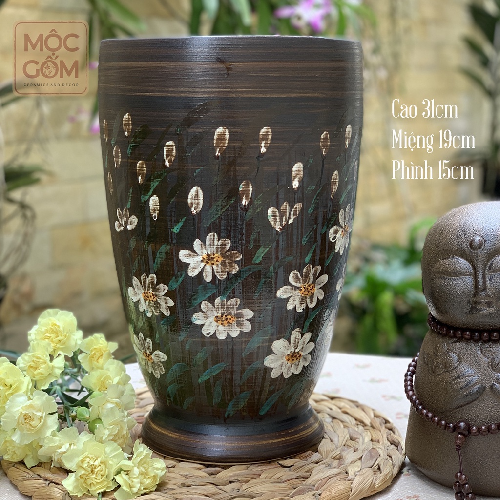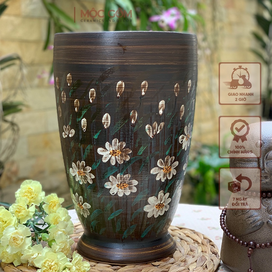 Nhà cửa & Đời sống > Trang trí nhà cửa > Bình trang trí || Bình hoa gốm Bát Tràng men mộc vẽ tay thủ công hoa cúc họa mi vintage - dáng ly đại | Mộc Gốm MG101Còn hàng