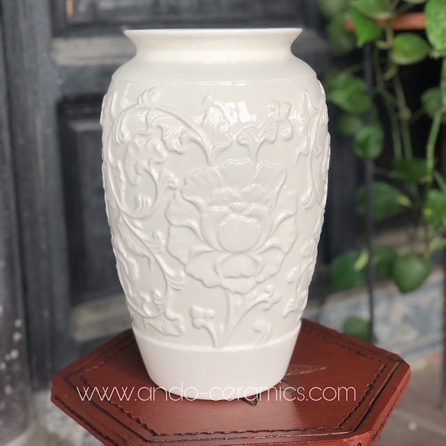 Bình Hoa Gốm Bát Tràng men trắng - Bình Chạm nổi Hoa hoạ tiết Phù Dung
