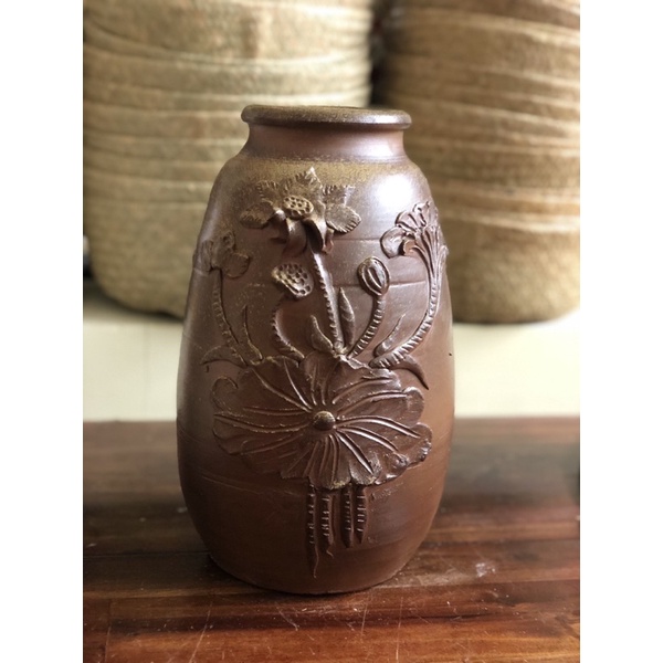 Bình hoa gốm sành thủ công, hàng vuốt tay không tráng men.Bình hoa văn 2 mặt, cao 31cm miệng 10cm.