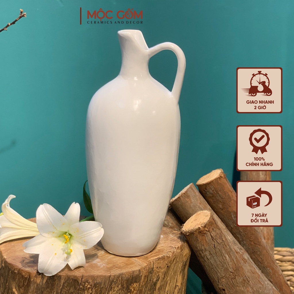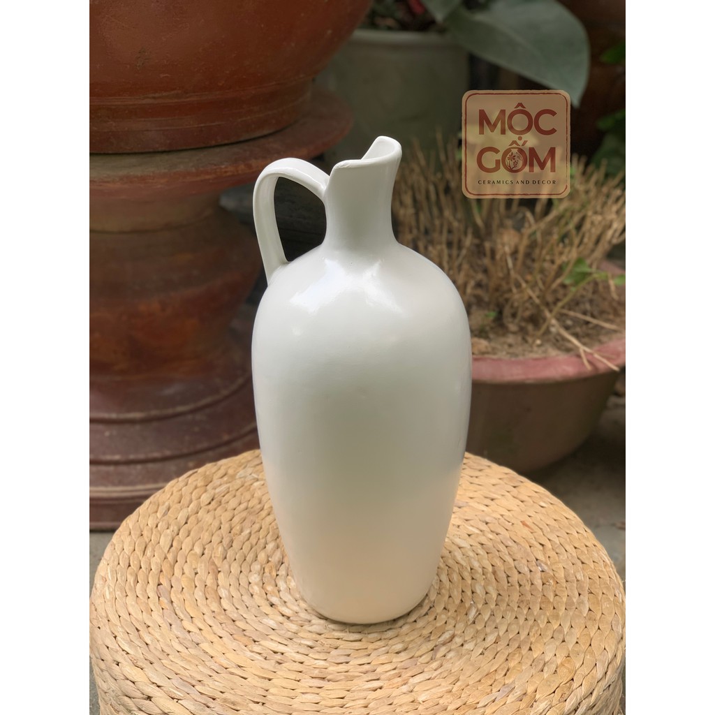 Bình hoa gốm sứ miệng cắt men, có quai màu trắng đẹp Bát Tràng trang trí nhà - Mộc Gốm