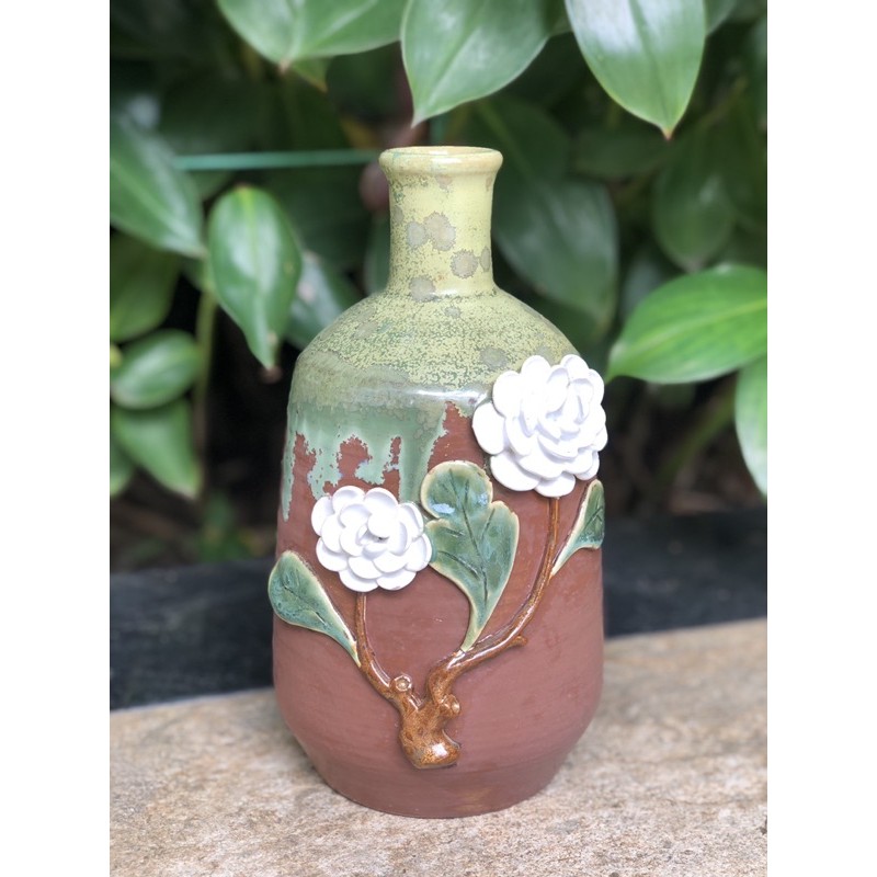 Bình cao 25cm, miệng 4cm đáy rộng 10cm.Gốm sứ vuốt tay hoàn toàn thủ công,