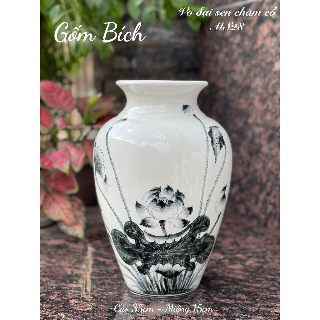 Bình Hoa Lọ Hoa Dáng Vò Sen Chàm Cổ Vẽ Sen Bụi Men Kem Đẹp - Gốm Sứ Bát Tràng