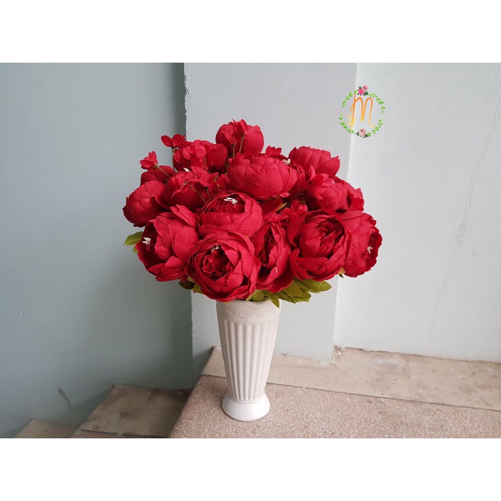 - Mỗi bình được cắm 3 cành hoa mẫu đơn bông lớn. Mỗi cành hoa lụa mẫu đơn có 8 bông lớn kèm các loại cành lá, và ngọn trang trí phối màu hài hòa. Chiều cao cành 47-50cm