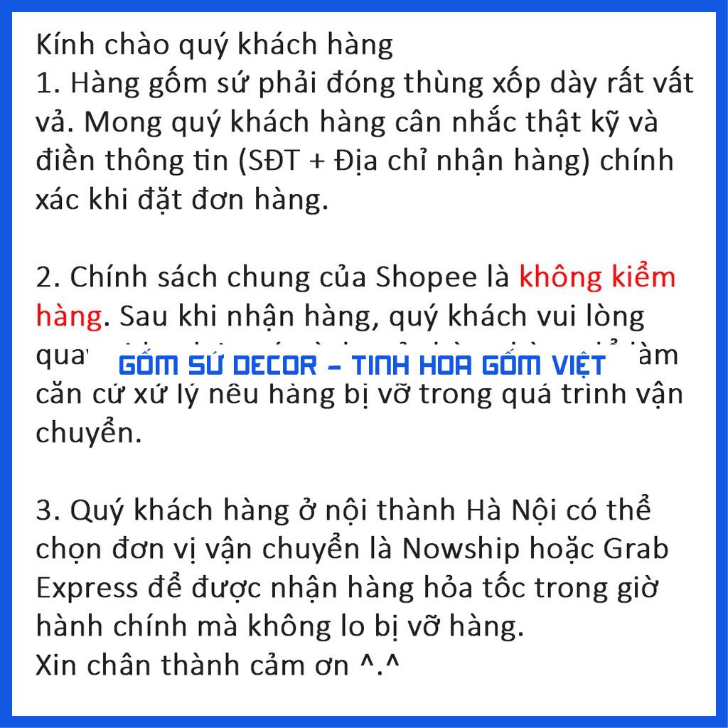 * Mô tả sản phẩm: Sứ Bát Tràng, men hỏa biến, tráng men trong ngoài. Dòng men hỏa biến sẽ có sự thay đổi về sắc độ theo nhiệt độ đun nên mỗi sản phẩm làm ra sẽ có sự chênh lệch về độ sáng/tối và đường vân trên lọ. Do đó mỗi sản phẩm làm ra sẽ là độc nhất vô nhị. Đồng thời dưới ánh sáng khác nhau sản phẩm cũng sẽ có sự khác biệt về màu sắc ạ. Quý khách vui lòng chú ý giúp shop ạ.