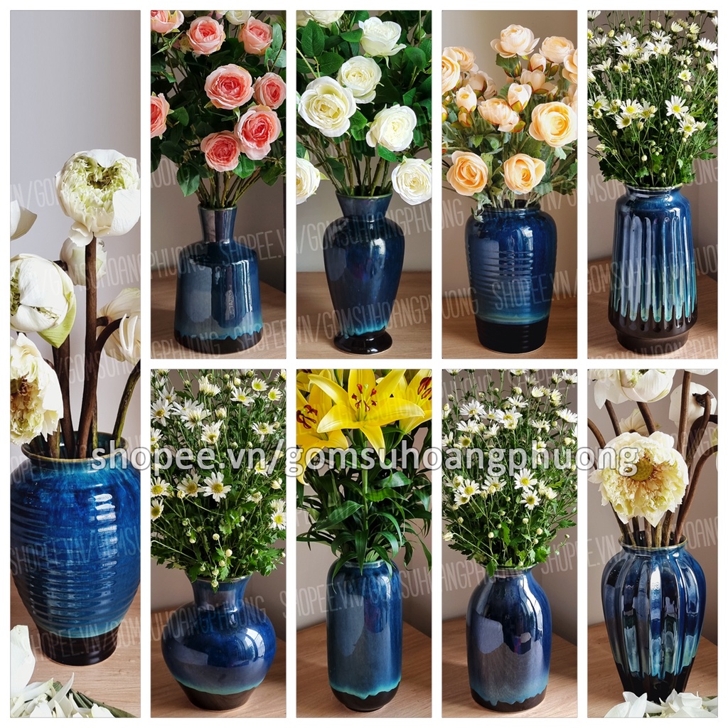 Bình hoa men hỏa biến Bát Tràng cỡ lớn - nhiều mẫu* Mô tả sản phẩm: Sứ Bát Tràng, men hỏa biến, tráng men trong ngoài. Dòng men hỏa biến sẽ có sự thay đổi về sắc độ theo nhiệt độ đun nên mỗi sản phẩm làm ra sẽ có sự chênh lệch về độ sáng/tối và đường vân trên lọ. Do đó mỗi sản phẩm làm ra sẽ là độc nhất vô nhị. Đồng thời dưới ánh sáng khác nhau sản phẩm cũng sẽ có sự khác biệt về màu sắc ạ. Quý khách vui lòng chú ý giúp shop ạ.