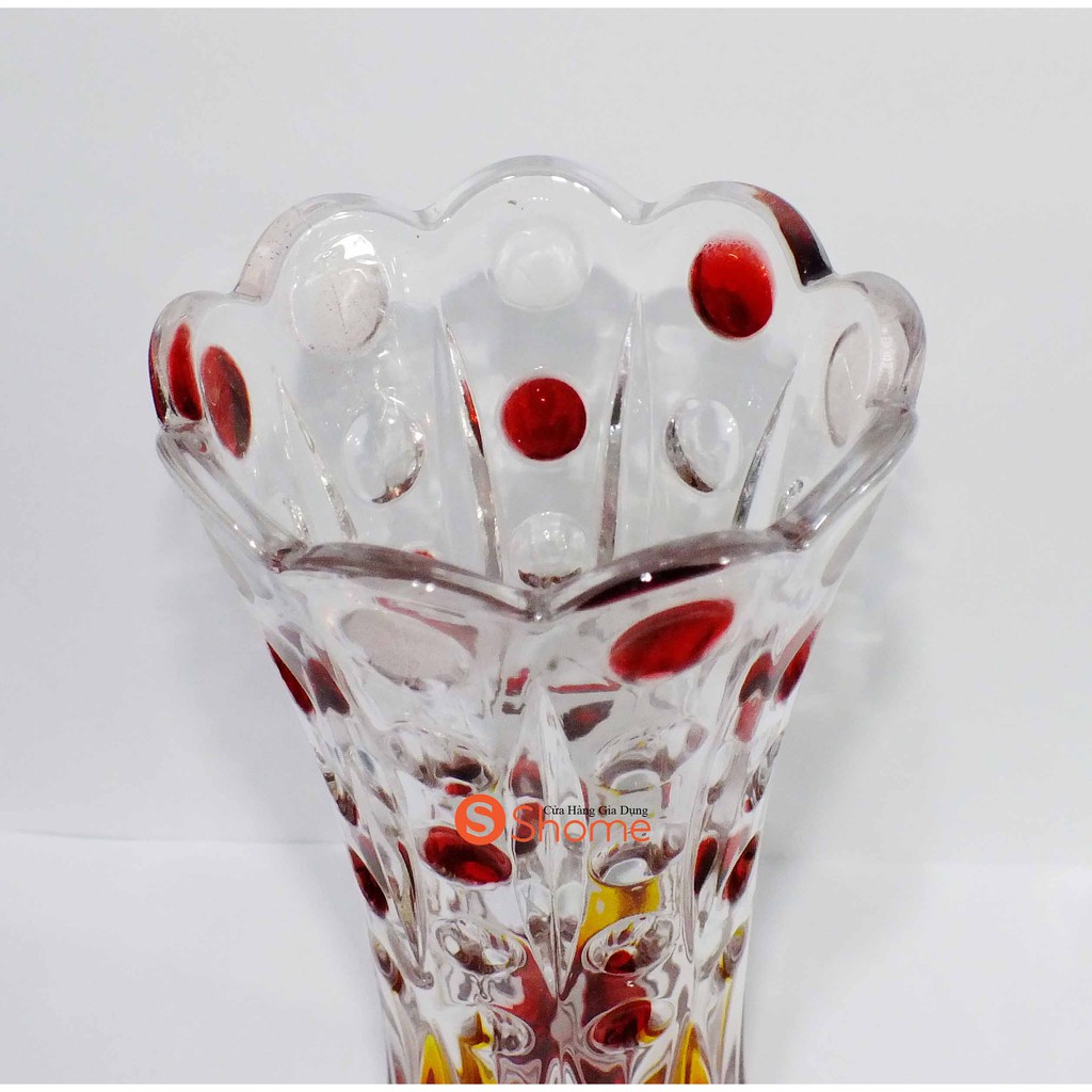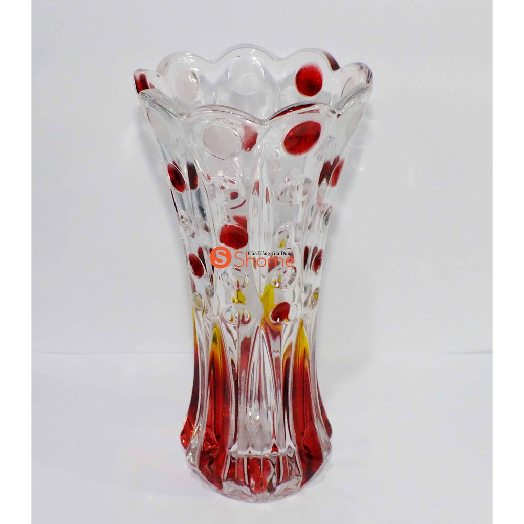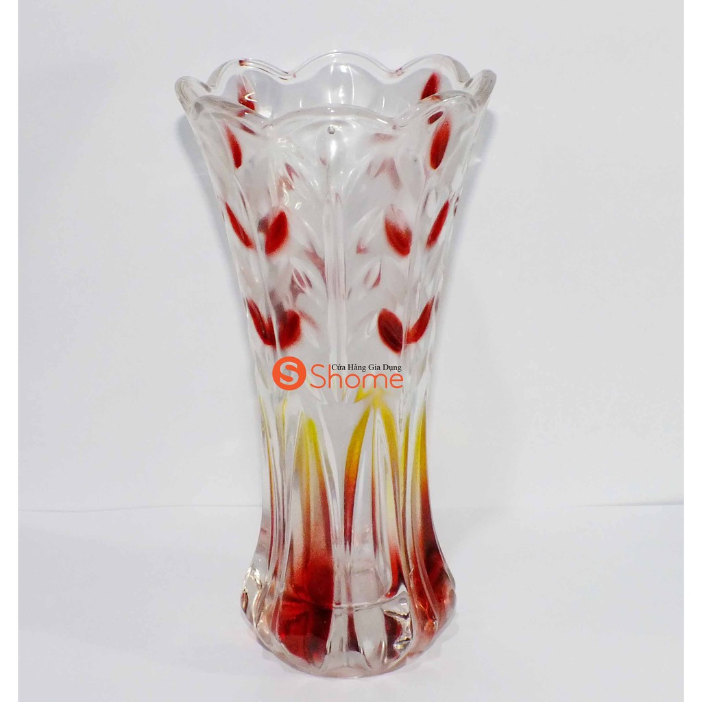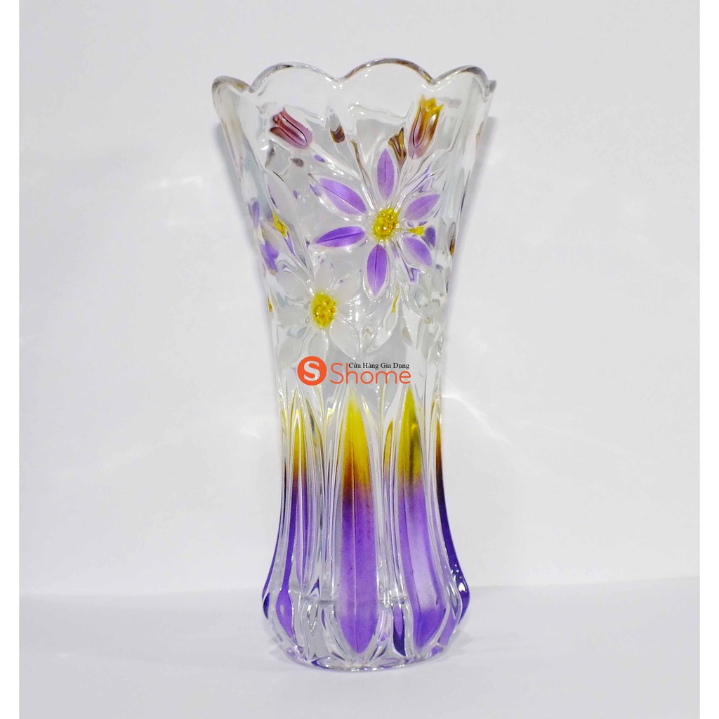 Bình hoa thủy tinh, cao 20cm , miệng 6cm , dáng xòethân bình với các họa tiết dc khắc trực tiếp lên thân ( hoa , bi, lá cỏ) với nhiều màu sắc tươi tắn