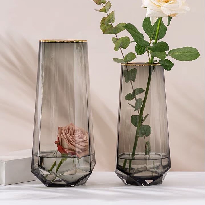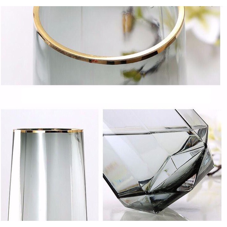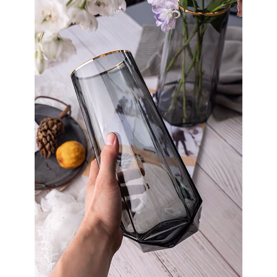 Bình hoa thuỷ tinh đáy đa giác miệng sơn mạ vàng cao cấp Qhouse , lọ hoa decor trang trí nội thất phong cách Bắc Âu