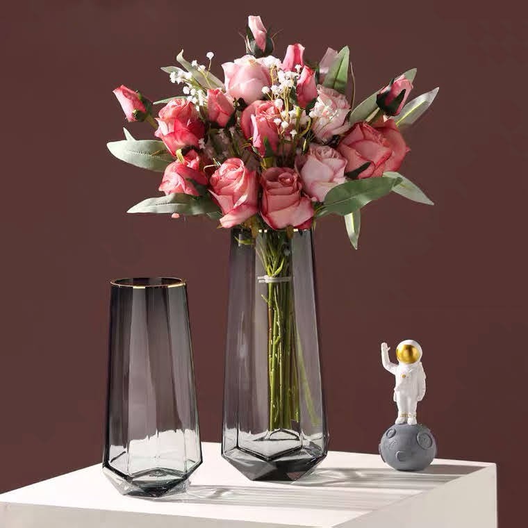 Giới thiệu Bình hoa thuỷ tinh đáy đa giác miệng sơn mạ vàng cao cấp Qhouse , lọ hoa decor trang trí nội thất phong cách Bắc Âu
