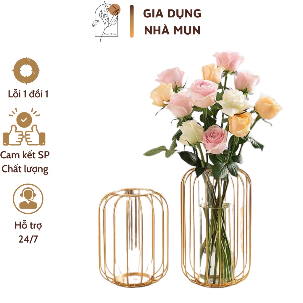 Chất Liệu Và Kết Cấu Sản Phẩm: Bình cắm hoa có khung bên ngoài sơn màu vàng chống rỉ, bên trong có lõi thủy tinh cao cấp, độ dày thuỷ tinh từ 0,3 - 0,5 cm.