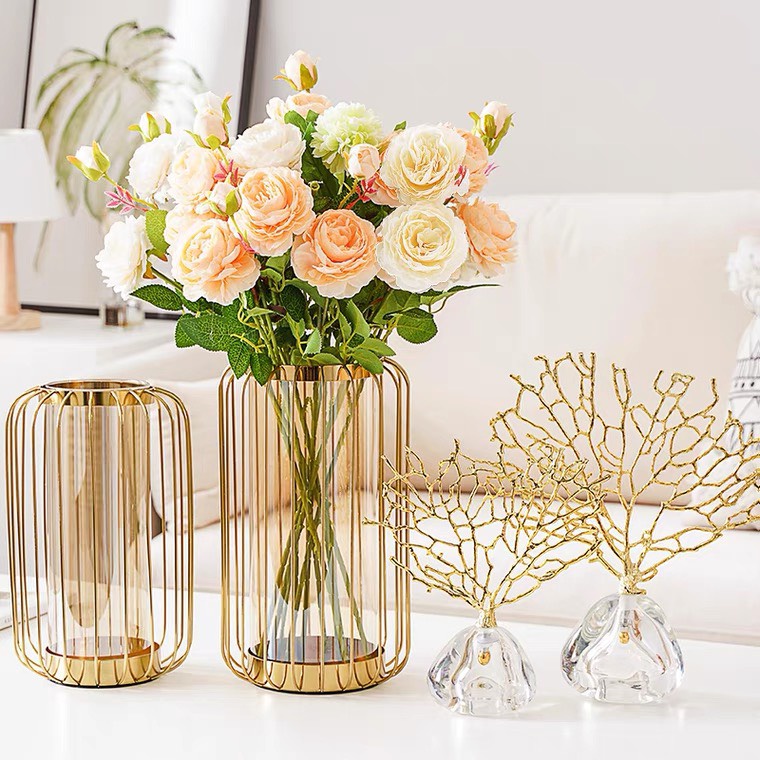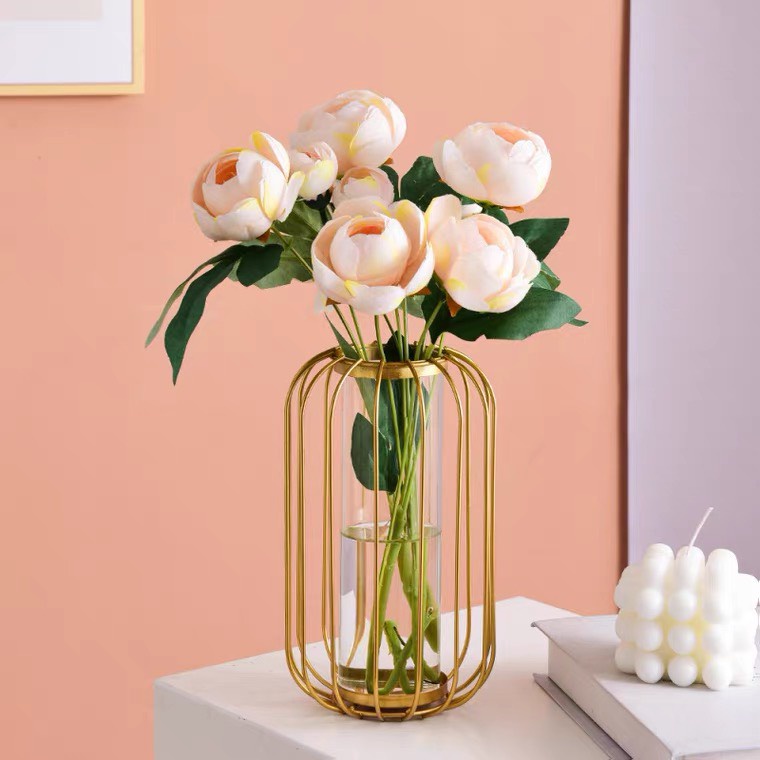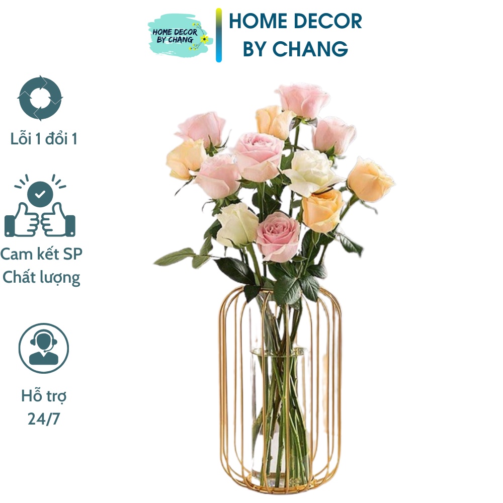 Chất Liệu Và Kết Cấu Sản Phẩm: Bình cắm hoa có khung bên ngoài sơn màu vàng chống rỉ, bên trong có lõi thủy tinh cao cấp, độ dày thuỷ tinh từ 0,3 - 0,5 cm.