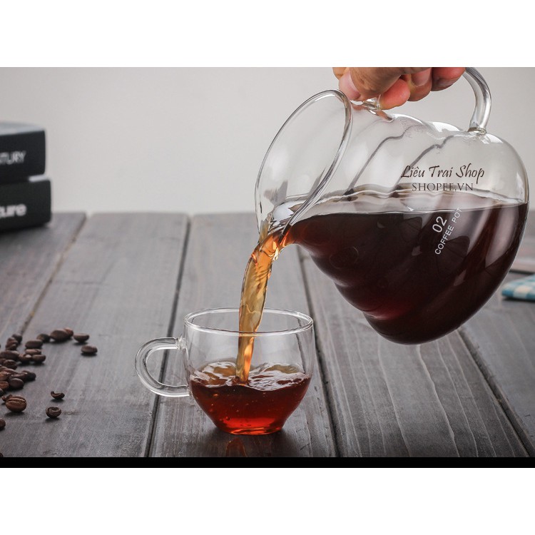 Bình được sinh ra để pha chế chia đong cà phê, pour over, bình có thiết kế dạng cong nhiều phần giúp tăng khả năng hoà tan và giúp barista ước chừng lượng nước.Bình được làm từ thuỷ tinh borosilicate chịu được nhiệt độ cao, từ -20 độ C đến 150 độ C, bề mặt nhẵn mịn dễ vệ sinh, khó trầy xước, độ trong suốt cao