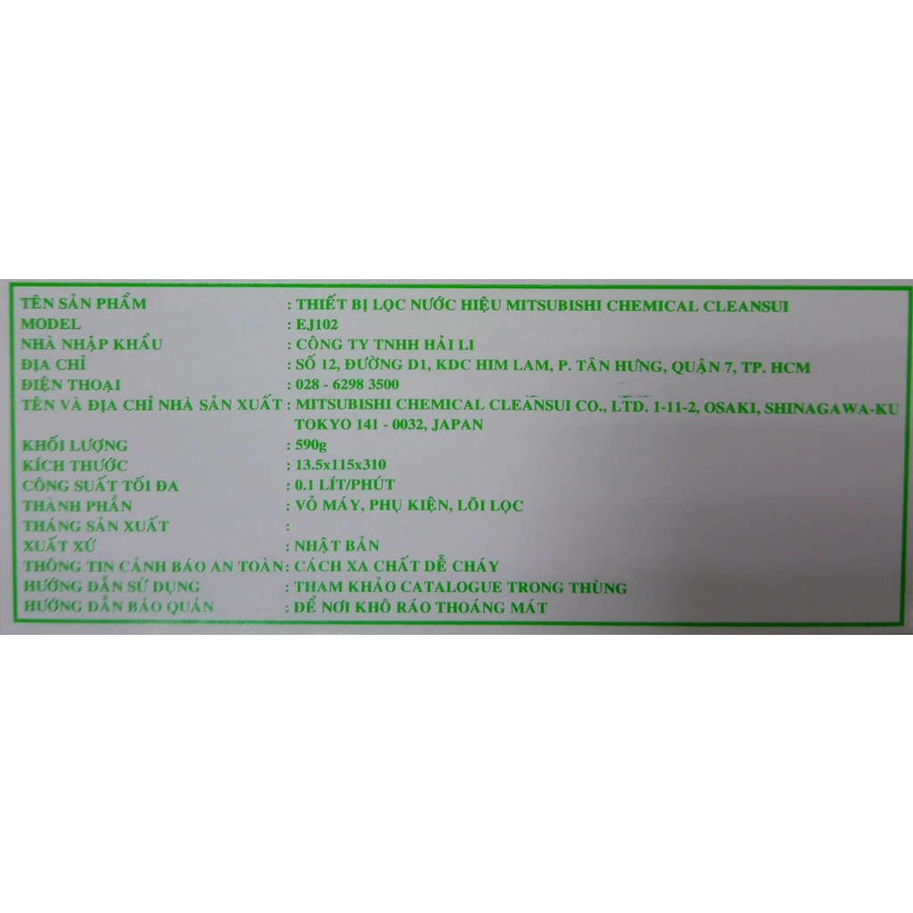 Bình Lọc Nước Cầm Tay Mitsubishi Cleansui EJ102 sản xuất tại Nhật Bản, đạt chuẩn chất lượng công nghệ Nhật Bản, nguồn nước an toàn theo chuẩn Việt Nam, cho bạn tự tin sử dụng hằng ngày.