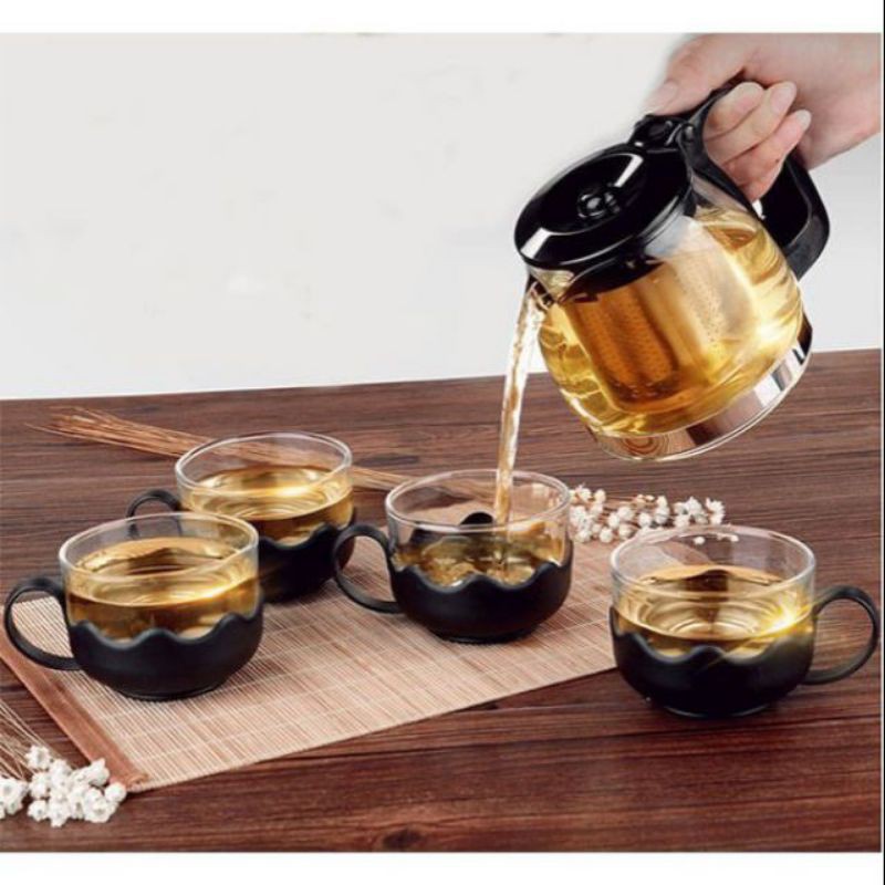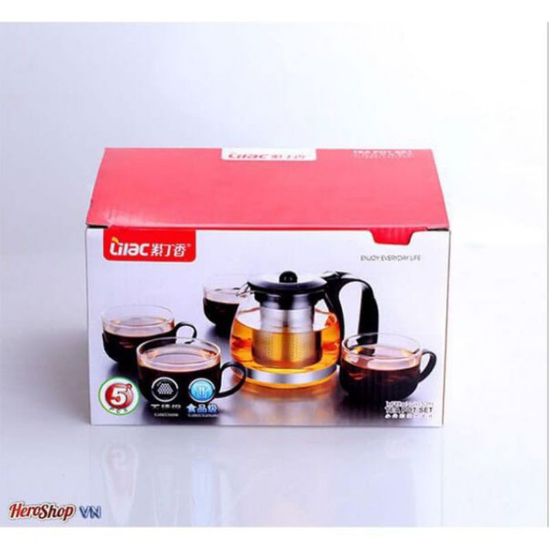 Bộ bình lọc trà thủy tinh kèm 4 ly lưới lọc Inox 304 cao cấp