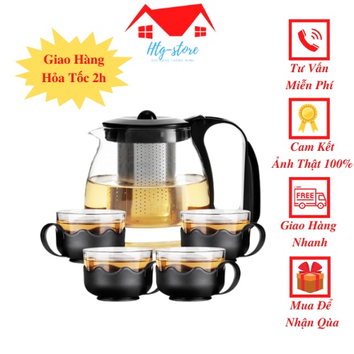 Bộ bình lọc trà thủy tinh lưới lọc inox 304 kèm 4 ly uống nước siêu sinh