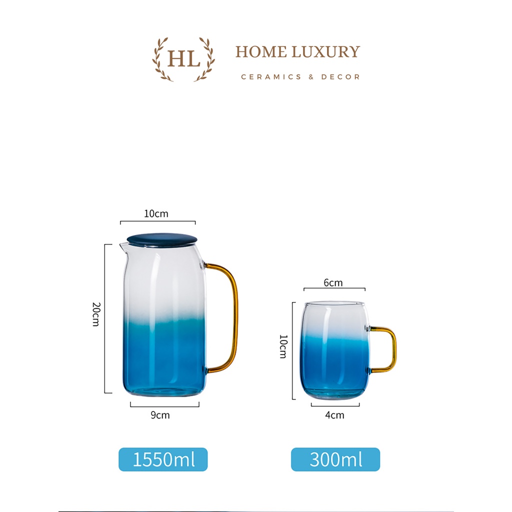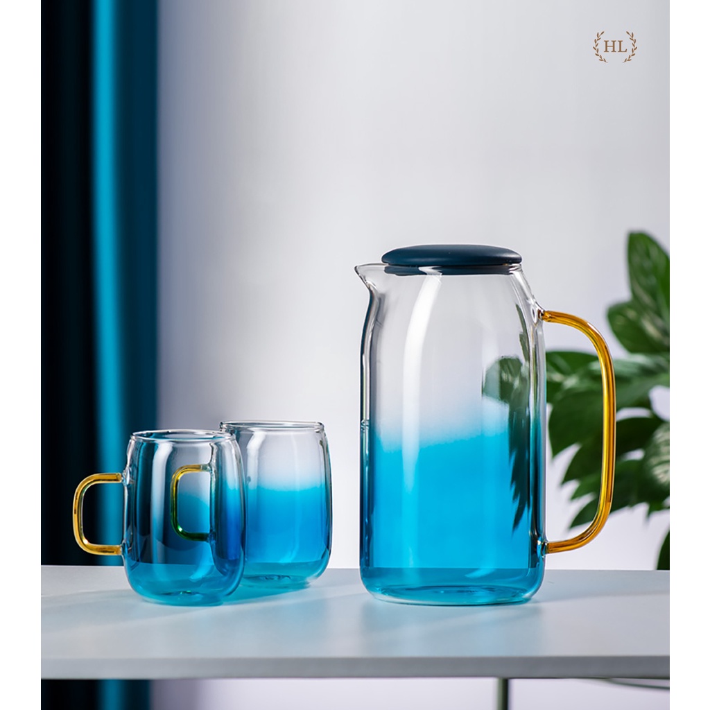 Bình và ly được thiết kế bằng chất liệu Borosilicate Cao Cấp theo phong cách Châu Âu mang lại cho người sử dụng một cách tinh tế. Với tông màu xanh Aqua tạo nên tính sang trọng ngoại hình bắt mắt. Với độ sắc xảo phun sơn xanh chiềm dần thể hiện phong cách Châu Âu.
