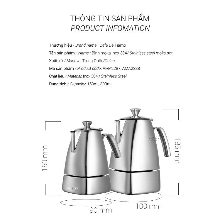 Tên sản phẩm: Bình Moka pot Inox 304 Tiamo- Công ty chịu trách nhiệm về hàng hóa: CÔNG TY TNHH CÀ PHÊ VOLCANO