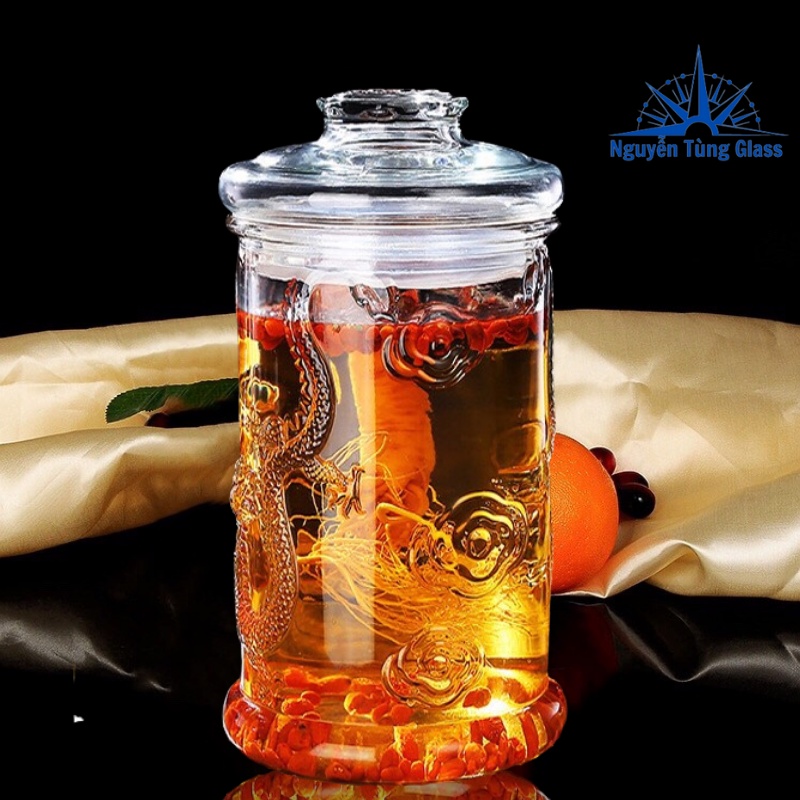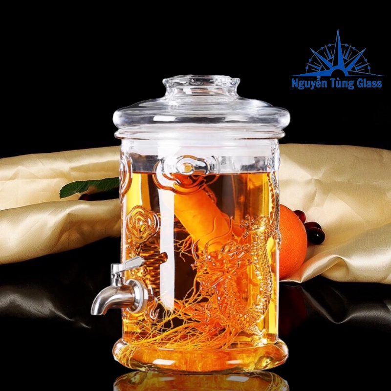 Bình ngâm rượu thủy tinh 8 lít dáng trụ hoa văn rồng
