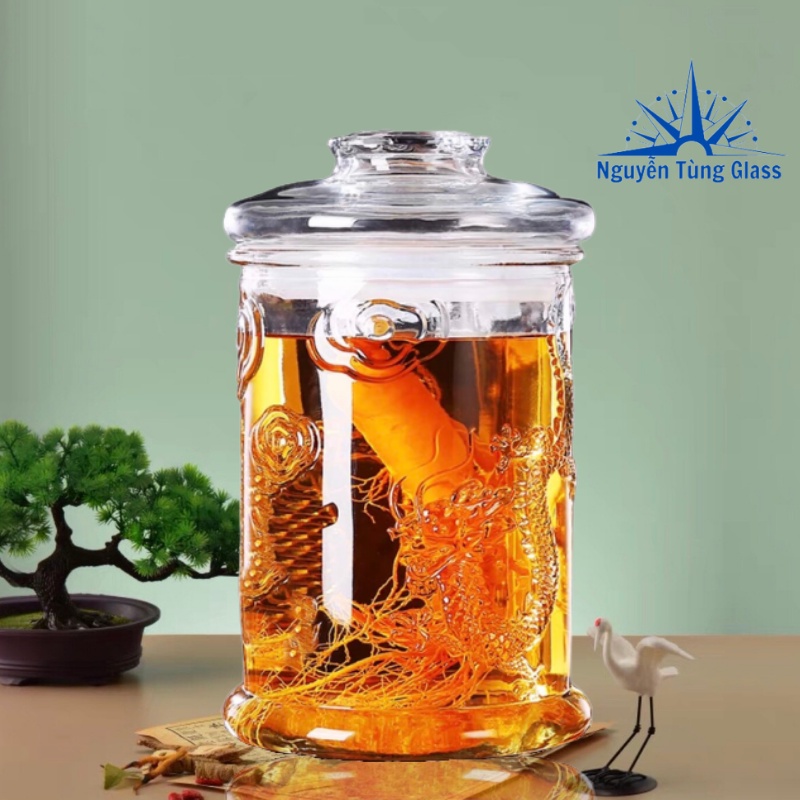 Bình ngâm rượu thủy tinh dáng trụ có hoa văn rồng 8 lít có văn với kiểu dáng hình trụ, tròn đều, thẳng đứng,