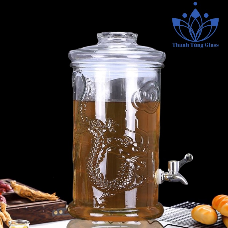 Bình ngâm rượu thủy tinh dáng trụ có hoa văn rồng 6 lít với kiểu dáng hình trụ, tròn đều, thẳng đứng, với dung tích 5 lít