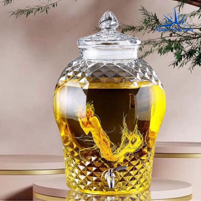 Giới thiệu Bình ngâm rượu thủy tinh họa tiết kim cương 6 lít có vòi & không vòi