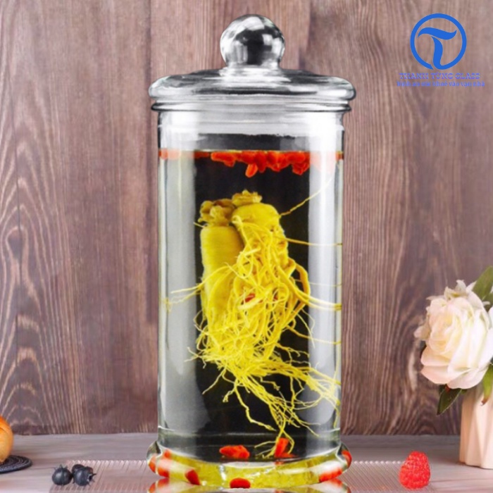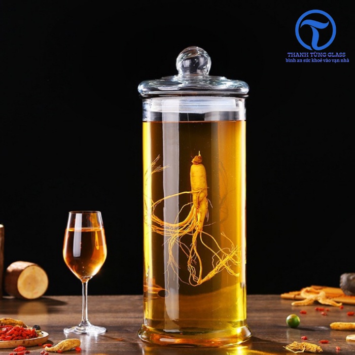 Bình ngâm rượu thủy tinh được thiết kế dạng hình trụ tròn trơn.