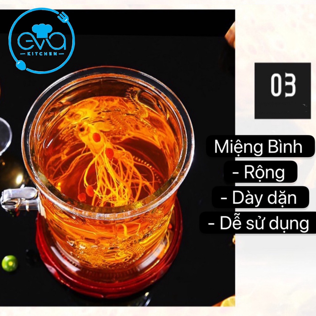 - Độ dày bình ngâm sâm thủy tinh dáng trụ hoa văn rông hơn 3ly, thân hình trụ có hoa văn hình con rồng ôm xung quanh bình, tạo hình sang trọng, sạch sẽ, nỗi bật vật ngâm bên trong.