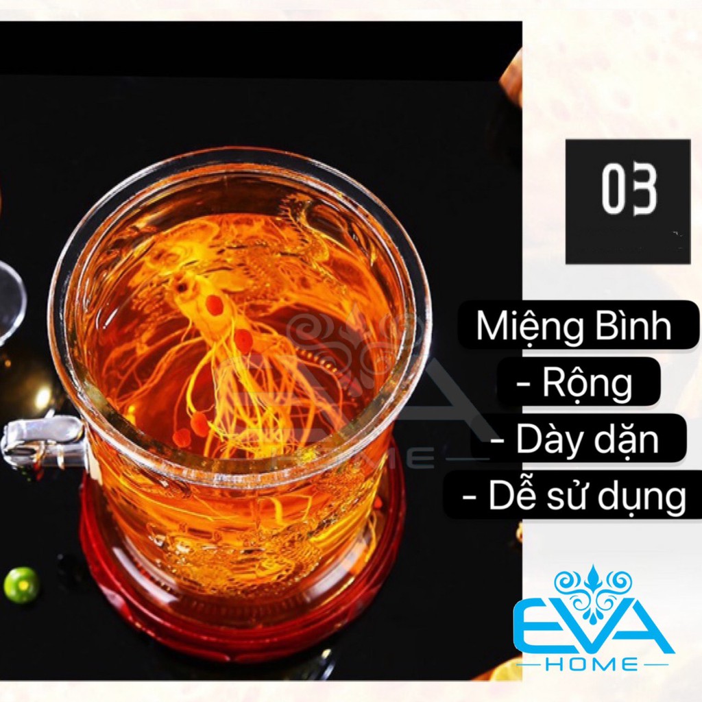 - Bình Thủy Tinh Ngâm Sâm 6 lít dáng trụ rồng còn có vẻ bề ngoài bắt mắt, với các đường nổi trên bề mặt hình con rồng và điểm nhấn là nắp thủy tinh và hình dáng Trụ Thẳng đứng.