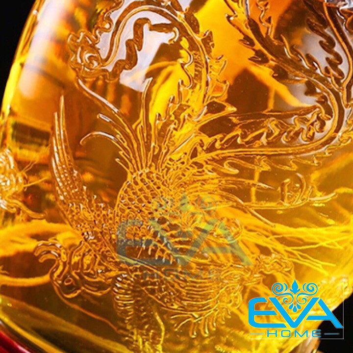 - Bình Thủy Tinh Ngâm Sâm 6 Lít có van dáng chum rồng phụng có Kiếu dáng sang trọng bắt mắt . Thiết kế nổi bậc với 1 bên là hình con Rồng, và 1 bên là hình Con Phụng bao quanh bình sâm.